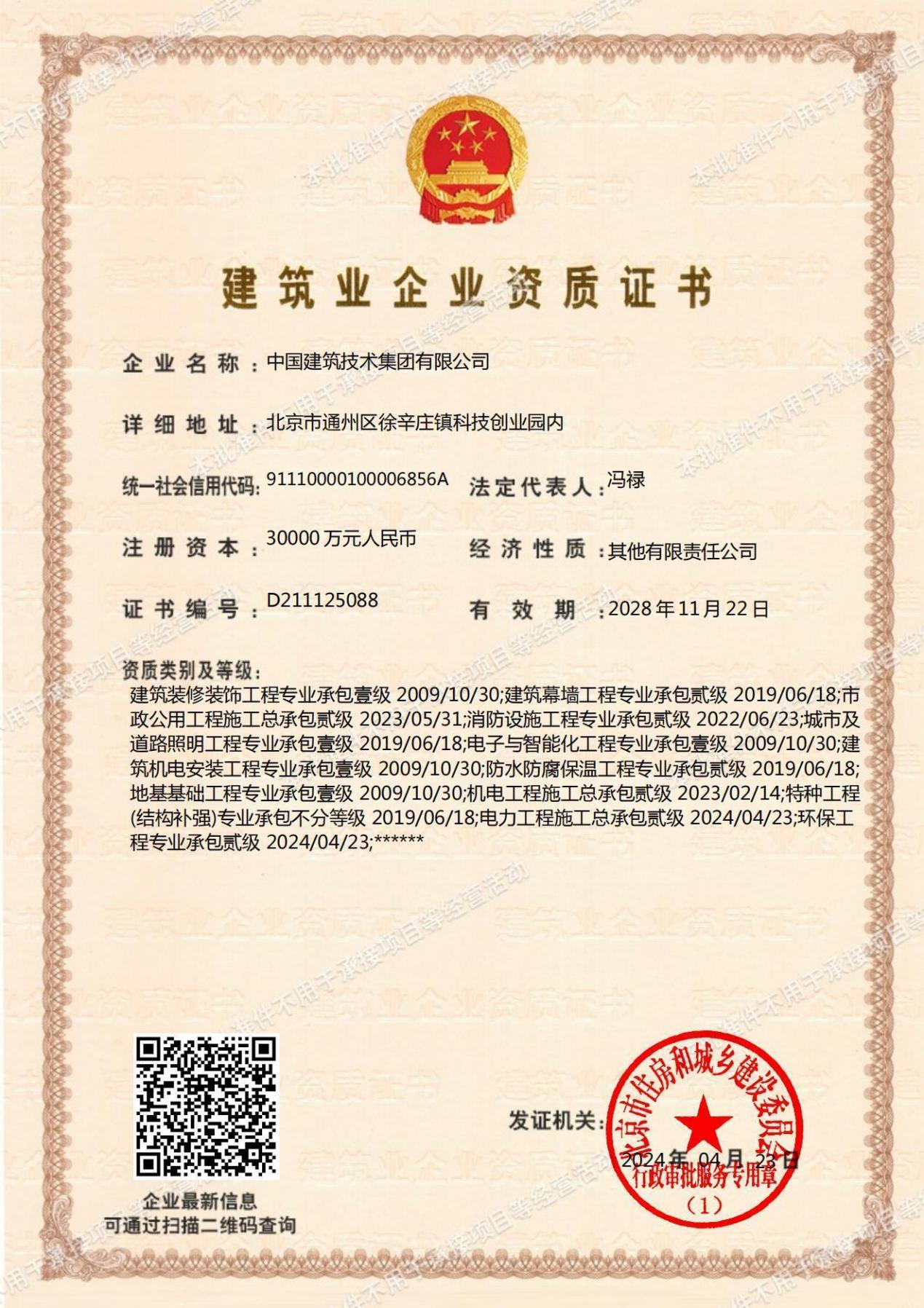 近年來,中國建技致力于完善資質平臺建設,形成了覆蓋規劃、勘察、設計、施工、監理、咨詢、檢測與服務等領域的全產業鏈資質矩陣。勘察設計領域,擁有工程勘察專業類(巖土工程)甲級、建筑行業(建筑工程)甲級、風景園林工程設計專項甲級、城鄉規劃編制甲級、土地規劃乙級、測繪工程測量乙級、勞務類(工程鉆探)乙級等多項資質;工程施工領域,擁有建筑工程施工壹級、市政公用工程貳級、機電工程施工貳級、電力工程施工貳級四項總承包資質;鋼結構、地基基礎、裝修裝飾、機電安裝、道路照明、電子與智能化等專業承包壹級資質;建筑幕墻、消防設施、防水防腐保溫等專業承包貳級資質;工程監理領域,具備屋建筑工程監理甲級資質,開創了以科研引領、設計助力、施工驅動的一體化經營新局面。