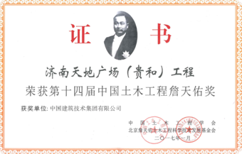 設計三所設計的濟南天地廣場(貴和)項目榮獲“第十四屆中國土木工程詹天佑獎”。中國土木工程詹天佑獎(簡稱詹天佑獎)是經科技部核準,建設部認定,在建設部、鐵道部、交通部、水利部的共同支持與指導下,以弘揚科技創新精神,表彰獎勵在科技創新與新技術應用中成績顯著的工程項目為宗旨的獎項,是我國土木工程建設領域的最高榮譽獎。項目負責人石巍代表設計三所于2017年4月14日參加了頒獎大會。