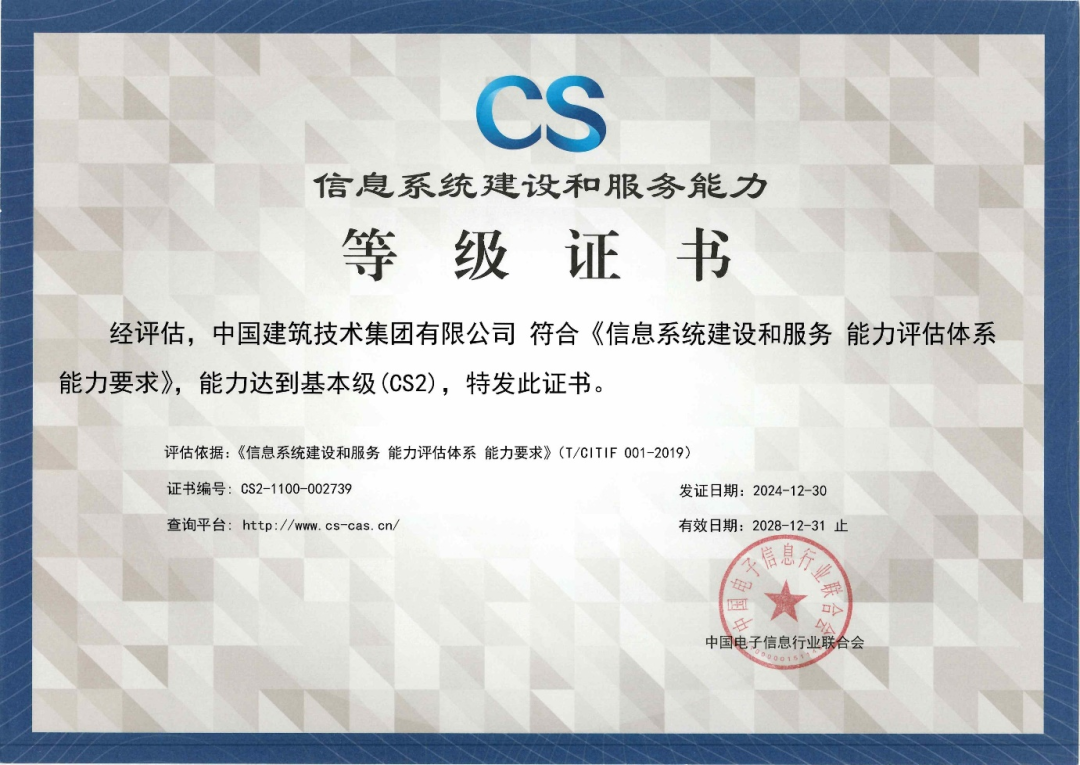 近日,中國建技成功通過中國電子信息行業(yè)聯(lián)合會評審,榮獲CS2信息系統(tǒng)建設和服務能力認證。這是中國建技繼質(zhì)量、環(huán)境、職業(yè)健康安全、信息技術(shù)服務、信息安全管理體系認證后,獲得的又一項國家級權(quán)威認證。