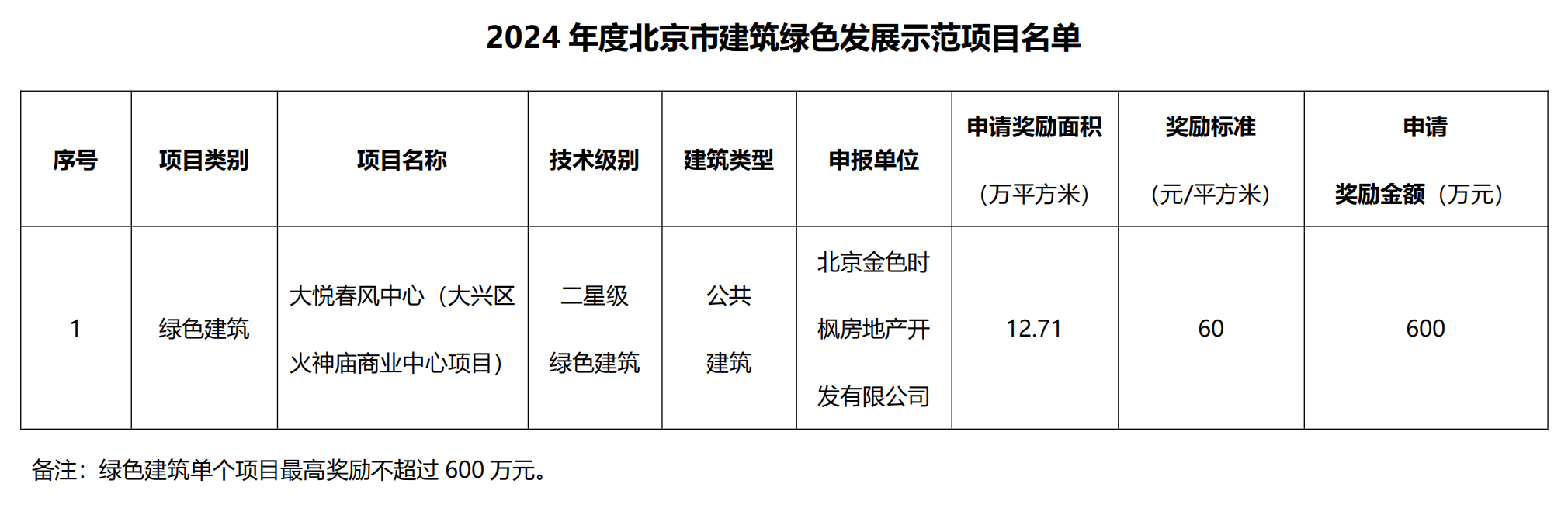 近日,由中國建技承擔咨詢的北京大興大悅春風中心項目通過了北京市綠色建筑標識獎勵資金審核,獲得了封頂600萬的市級資金獎勵,成為北京市2024年唯一一個獲得市級綠色建筑獎勵資金的項目。