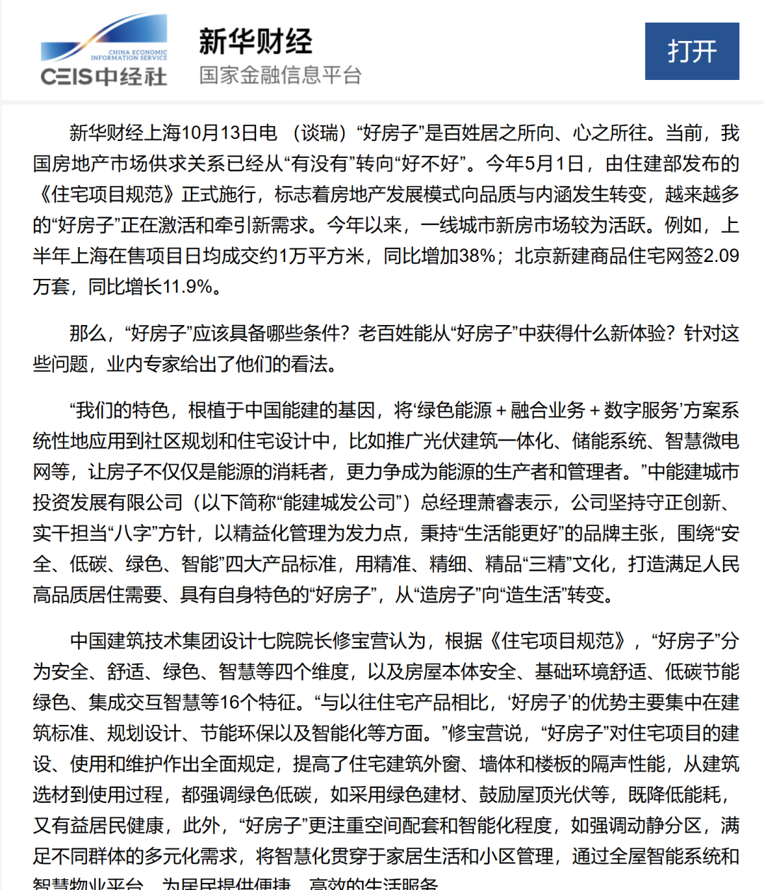 近日,“好房子”建設(shè)成為行業(yè)關(guān)注焦點——中國建技與中國能源建設(shè)股份有限公司(以下簡稱“中國能建”)在“好房子”領(lǐng)域的探索與實踐,獲新華財經(jīng)、央廣網(wǎng)、國資委官網(wǎng)、《中國證券報》等主流媒體高頻報道。多層次、立體化的傳播矩陣不僅讓相關(guān)話題迅速破圈,單條報道最高閱讀量更突破130萬,充分彰顯兩家企業(yè)在“好房子”建設(shè)中的行業(yè)引領(lǐng)力,也印證了“好房子”理念與百姓宜居宜業(yè)需求的深度契合。