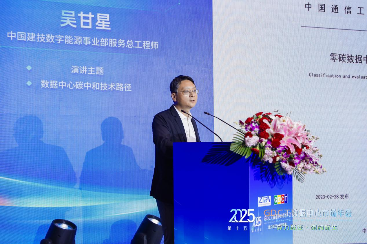 中國(guó)建技數(shù)字能源事業(yè)部服務(wù)總工程師吳甘星分享了主題為《數(shù)據(jù)中心碳中和技術(shù)路徑》的主旨演講,系統(tǒng)闡釋了數(shù)據(jù)中心碳足跡分析方法及碳中和技術(shù)路線,提出“能源側(cè)清潔化、用能側(cè)高效化、管理側(cè)智能化”的三角支撐體系,并分享了中國(guó)建技在碳中領(lǐng)域的科研創(chuàng)新成果和工程實(shí)踐經(jīng)驗(yàn)。