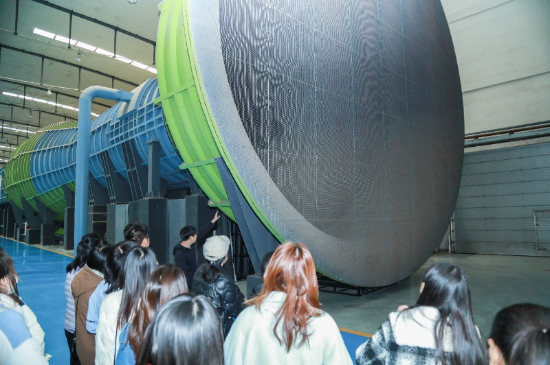 進入實驗室,首先映入眼簾的是藍綠相間的巨大“喇叭”,也是今天的“主角”——建筑風洞。“此風洞長96.5米,是直流下吹式大氣邊界層風洞,此風洞可以進行多項科學試驗,為保證建筑的安全性和舒適性提供強大的‘后盾’。”在薛原博士的帶領下,參觀人員來到“喇叭口”了解風洞動力段的運行原理,近距離看到風扇葉片的構造。沿著風洞,接著來到中間的穩定段,參觀人員深入了解風洞內部蜂窩器和阻尼網的構造和重要作用。經過風洞的兩個實驗段,最后來到擴張段,在這里風可以以更低的速度被排出。在專家的講解下,風洞每一段構造的科學秘密被逐漸揭開,參觀人員感受到建筑安全背后“科技屏障”的力量。