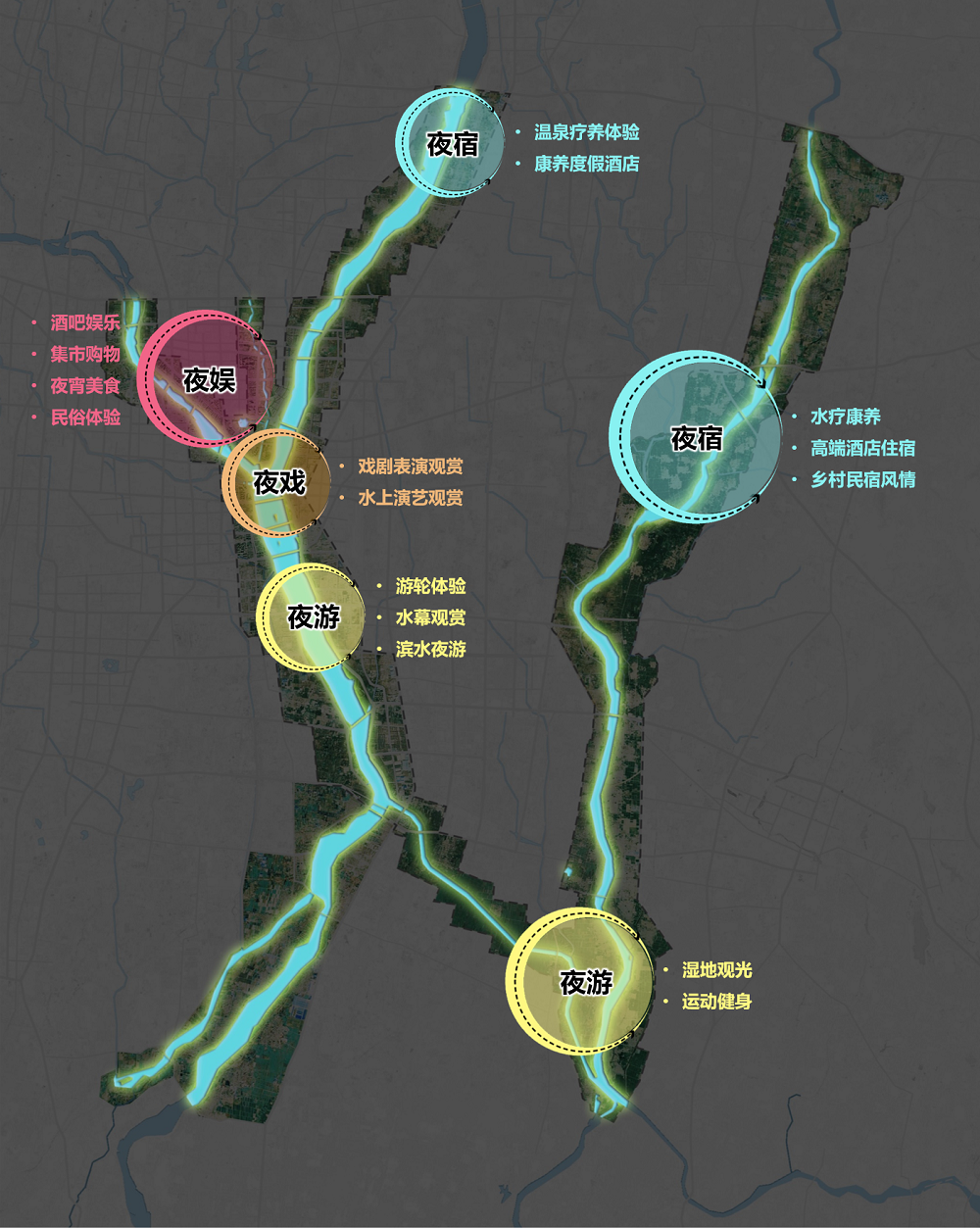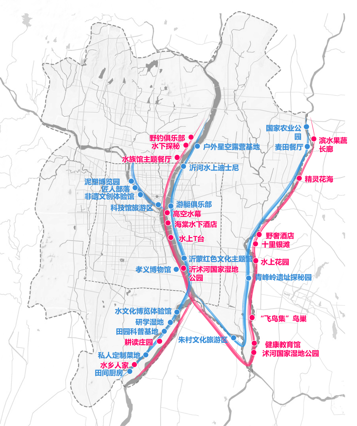 2.“水+旅游”專題——從“河流振興、因水而親、城鄉(xiāng)共榮”的角度出發(fā),通過對主要水系河流進行發(fā)展定位,完善河流旅游產品和項目業(yè)態(tài),以主題游線設計、沂水夜游、其他特色項目等為吸引點,優(yōu)化提升臨沂市水上旅游品質,樹立臨沂北方水城的品牌形象與市場競爭力。