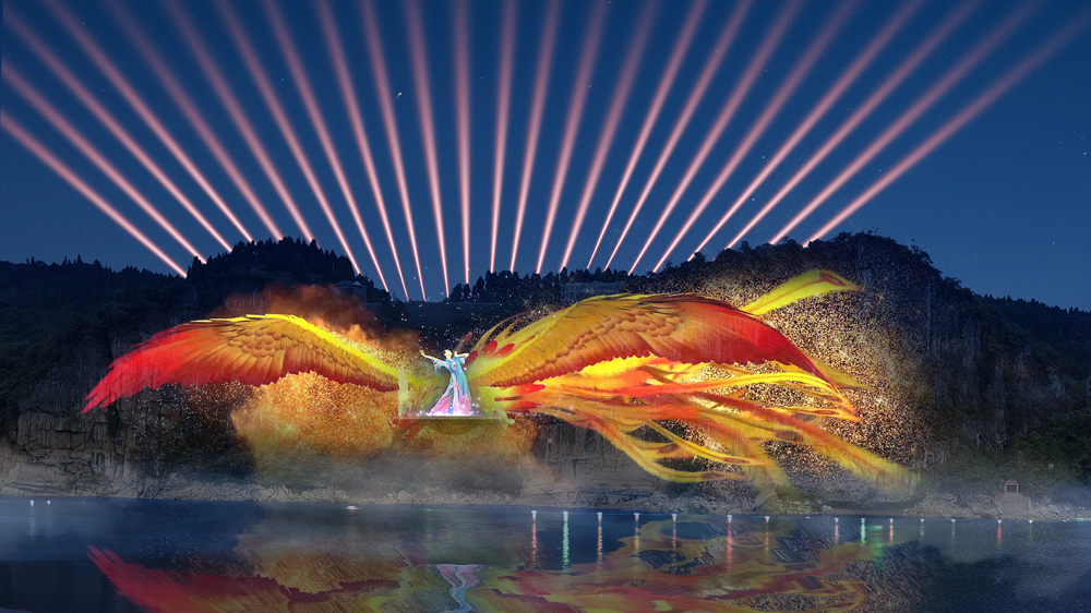 崖壁5D燈光秀尤為新穎,采用“崖壁投影+舞臺演繹”的方式,以兩側崖壁為投影載體,中間布置小舞臺配合燈光矩陣,將辛女與盤瓠的凄美愛情故事和妖怪來襲國破山河場面,將軍點兵出征的戲劇場面演繹得活靈活現。