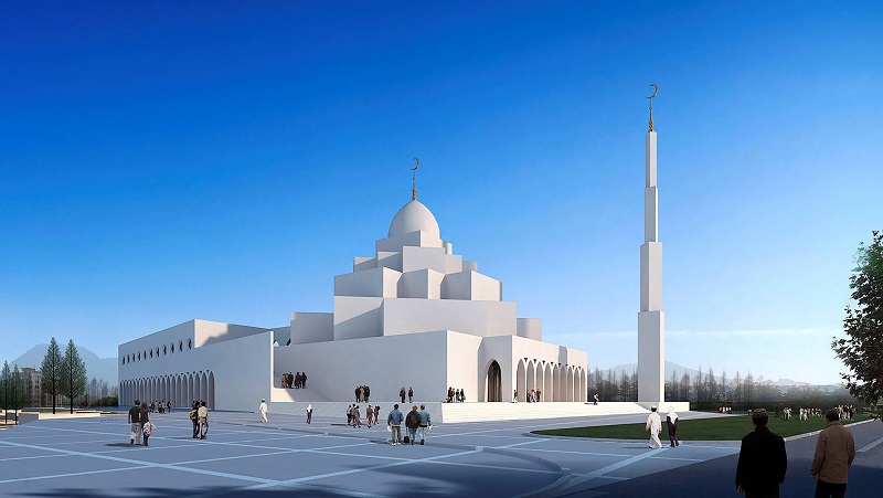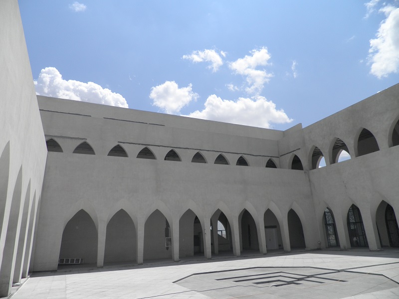 與禮拜殿相連的雙層環(huán)廊設(shè)計,通過一系列的拱形門柱,將庭院緊密環(huán)抱。門柱的拱形在延續(xù)13-15世紀(jì)建筑風(fēng)格的基礎(chǔ)上,又加以了創(chuàng)新,門拱如扭曲的柳葉,形成自然曲面,朝向庭院。潔白的環(huán)廊與麻石地面,所構(gòu)成的機(jī)理對比,給人以莊嚴(yán)、樸實的印象。37m高的宣禮塔同樣采用運(yùn)用了同構(gòu)原理,將鋼結(jié)構(gòu)三棱柱體以幾何關(guān)系層層遞減,塔頂?shù)膶毱亢驮卵佬窝b飾物,與禮拜殿穹頂上的標(biāo)志遙相呼應(yīng),構(gòu)成伊斯蘭教"彎月涵星"象征。