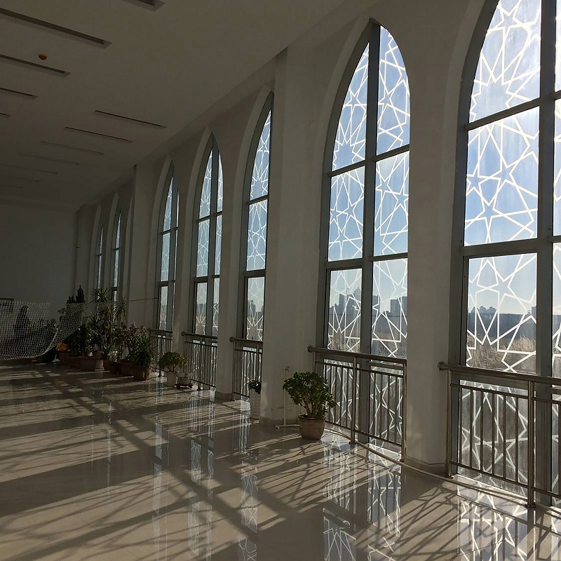 沿西北角三段式大臺階而上,可到達(dá)清真寺最重要部分的禮拜殿,也是建筑設(shè)計的“點睛”之筆:禮拜殿和穹頂?shù)脑O(shè)計,運(yùn)用了同構(gòu)原理,將伊斯蘭紋樣進(jìn)行分解、變化后,生成新的幾何形體,每一層退臺與建筑形體旋轉(zhuǎn)相結(jié)合,產(chǎn)生更多、更豐富的三角形平面組合,利用這些組合,為禮拜殿上空設(shè)計了“逐層退臺”的三角形采光窗。給禮拜殿帶來了豐富的自然光源。同時,一天內(nèi)的光束變化,也將人引向一個深邃的、神圣的、崇高的精神空間。