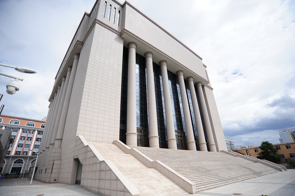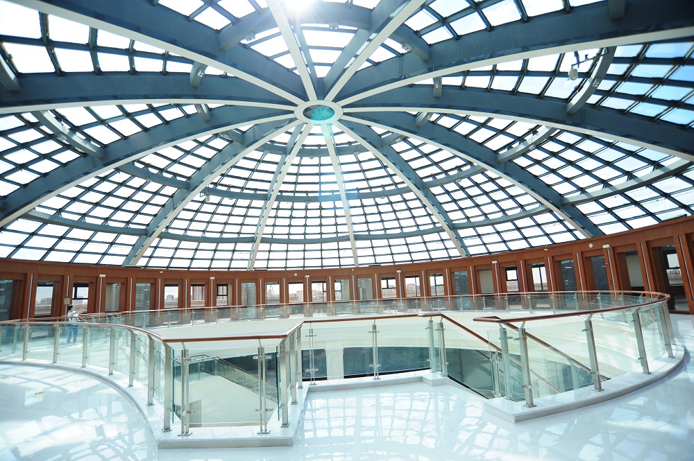 主體建筑長55.8米,寬61.2米,高54米,體量集中緊湊。外立面造型簡約、典雅,以中軸線東西對(duì)稱布局的形式表現(xiàn)了建筑的端莊、神圣。外裝飾石材實(shí)體墻、柱廊、玻璃幕的虛實(shí)對(duì)比光影的變化,表現(xiàn)了建筑的藝術(shù)美和恢弘氣勢(shì)。四個(gè)立面設(shè)計(jì)的柱廊每面6根共24根柱式,代表了一年四季24節(jié)氣,春夏秋冬,四季常青,蘊(yùn)含著自然和生命的和諧,裝飾柱被譽(yù)為“生命和平柱”。