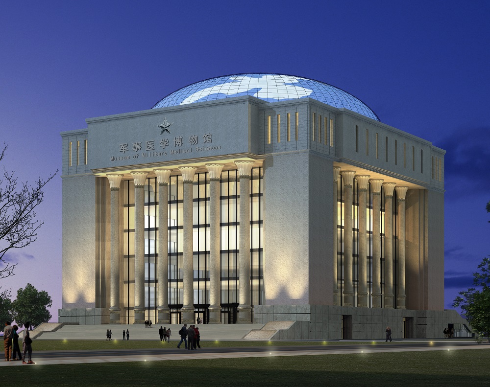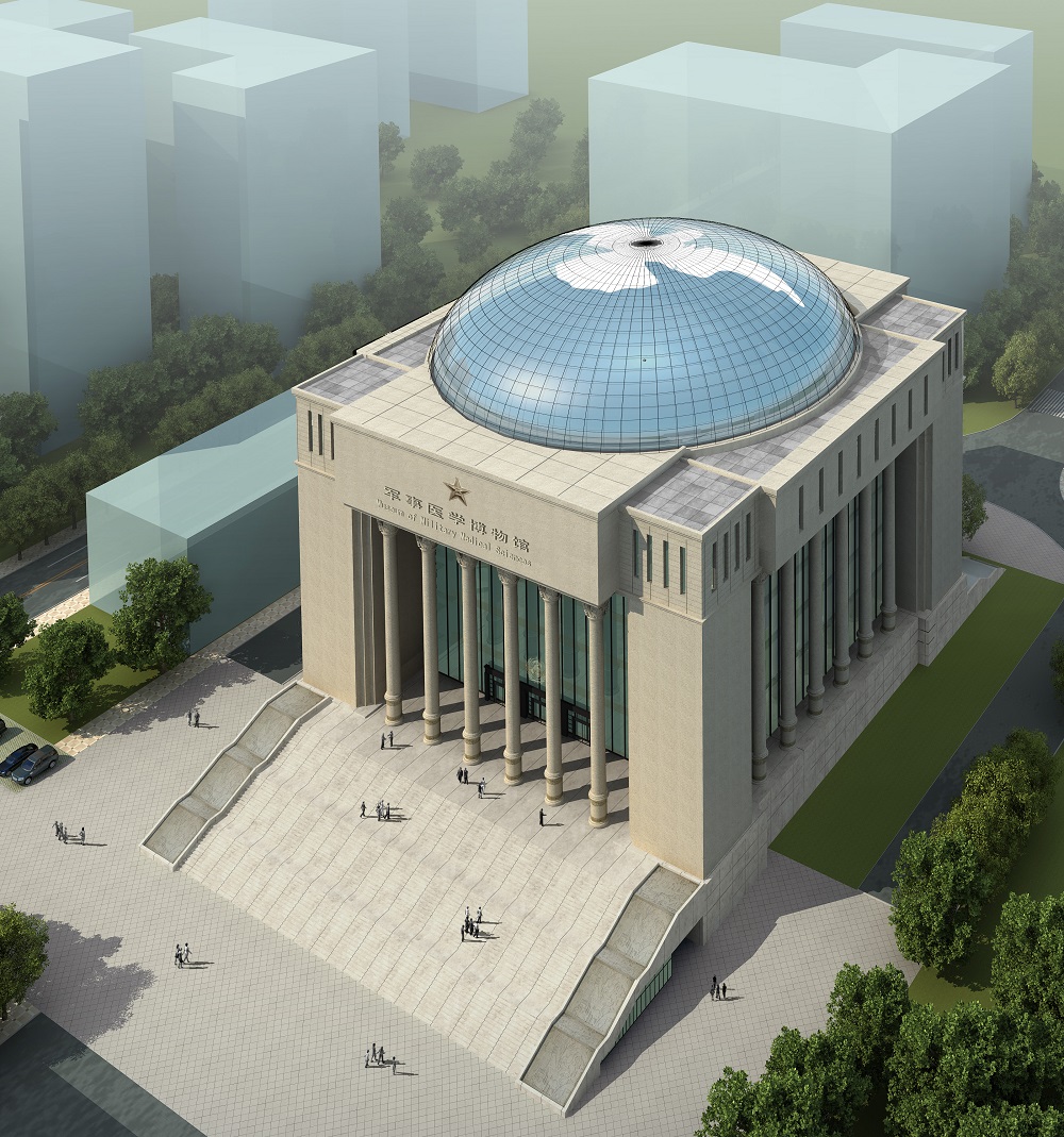中國人民解放軍軍事醫(yī)學(xué)博物館位于北京市海淀區(qū)太平路,軍事醫(yī)學(xué)研究院內(nèi)西南角,是一座國家級(jí)大型軍事醫(yī)學(xué)類博物館。建筑用地0.873公頃,總建筑面積38000平方米。主體建筑方正,頂部圓形玻璃穹頂直徑47米,表達(dá)了天圓地方的中國文化理念。穹頂玻璃幕結(jié)合太陽能技術(shù),部分太陽能反射板組成和平鴿圖案,寓意世界和平,表達(dá)了設(shè)計(jì)的主題。